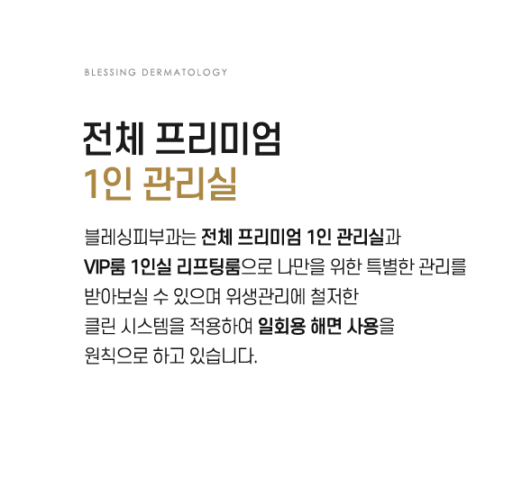 전체 프리미엄 1인 관리실, VIP룸 1인실 리프팅룸과 위생관리에 철저한 일회용 해면 사용을 원칙으로 하고 있습니다.